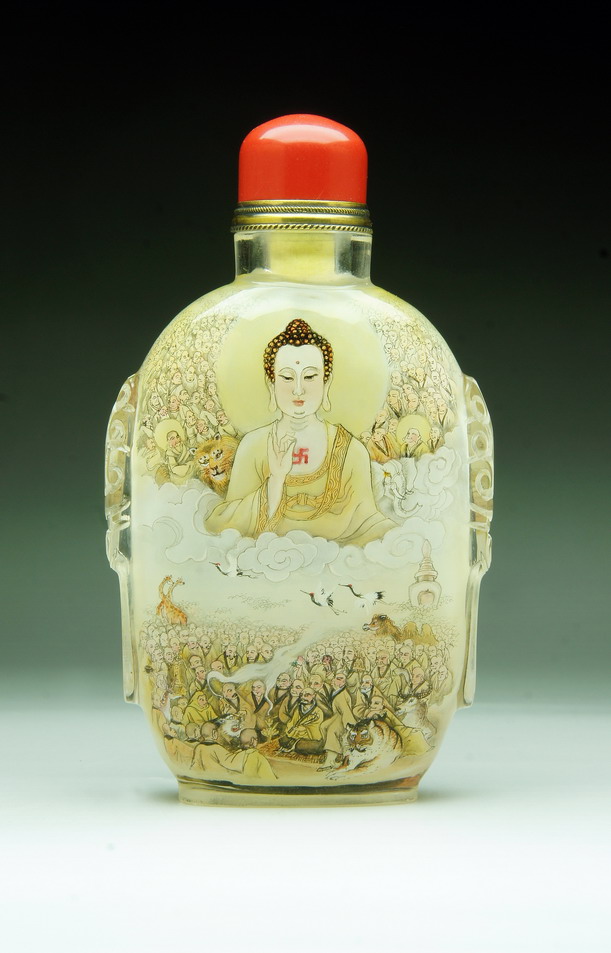 张颖,男,字泓颖,号秀峪斋主,1971年出生于山东.博山,自幼跟随国家级非物质文化遗产鲁派内画传承人、首届中国内画艺术大师艺术、首届中国琉璃艺术大师张广忠先生学习国画、内画艺术至今,现为:中国人民艺术家,中国国礼特供艺术家、国家一级美术师、山东内画艺术大师,山东省高级技师、中国日用玻璃协会会员、中国工艺美术学会鼻烟壶专业委员会会员。内画作品“水浒一百零八将”获“2014第三届中国玻璃艺术名家展”金奖,内画作品“百骏图”获“第六届中国(山东)工艺美术精品博览会”金奖,内画作品“五百罗汉”“水浒一百零八将”两件作品入选“2014首届南通国际当代工艺美术双年展”,内画作品“百羊图”获第50届中国工艺品展览会”“金凤凰”银奖。内画作品“五百罗汉”获“2015第四届中国中国玻璃艺术名家展”金奖。(寒来换暑往,秋收忙冬藏。岁月如水流,两鬓已染霜。吾出生于孝乡,祖上正直善良。今生甚幸,自幼拜于张广忠先生门下,即习书画已近肆拾十载。多年来,不能锐进于学艺,偶有进步,不为同道诸子远甚,有可言焉!吾以多摹古人之笔墨,呈现作品之内涵,是吾对中国书画的感悟和理解。诚然,以吾今日学艺之浅,且学养之乏,作品多拙,敬请前辈与同仁指正,甚喜。生活参悟与其道法同,生活决定画之精神,画者、既有前辈传承,又要外师造化,中得心源。物为画之本也,吾为画之神也。有物无吾不足以通理想,有吾无物不足以达真实。叹今生以何者梦呓,且在笔墨间乎!诗曰:“笔做生涯砚作田,艺途漫漫阔无边,梦呓艰辛却含笑, 心头有苦也说甜,搜尽奇峰打底稿,千岩万壑记心间,此生追艺因何许,只为壶内有洞天”。