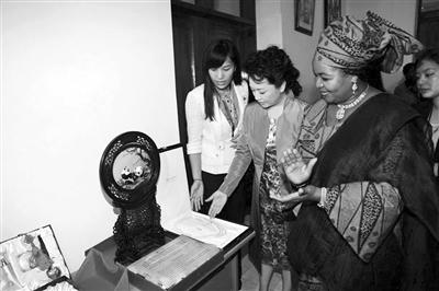 参观坦桑尼亚妇女与发展基金会时,彭丽媛送出了来自中国的品牌“阮仕珍珠”和“百雀羚”。
