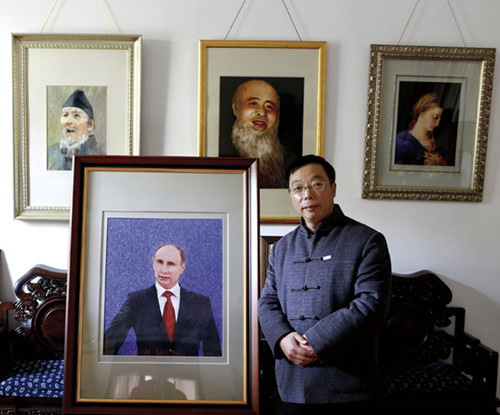 绣像中,普京身着黑色西服,雪白衬衣配红色格子领带,肩宽背直,显得英气勃勃。头微偏,嘴微张,栩栩如生,似乎正有惊人政见脱口而出。