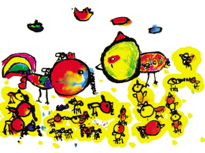 《鸡的一家》 张琼,女,5岁,1994年获日本第24届世界儿童画展外务大臣金牌