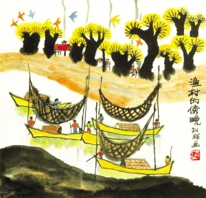 《渔村的傍晚》 刘琛,女,9岁,1989年获日本第19届世界儿童画展外务大臣金牌