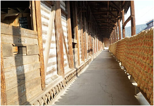 仓体呈东西走向,坐北朝南,通透性强;仓底架有纵横交错的隔空层,防潮透气。仓体木质敦厚,能达到自然恒温的作用。冬去春来,仓内一直保持在15—28度之间,这是最利于黑茶醇化的室温。通过隔空层的对流作用,茶品于此醇化,清洁干燥、不易变质。且充分的氧气供给,加速了毛茶和成品的转化速度,以两倍的醇化速度蒸腾转化,成品茶在问世前即锁定了木仓陈芳和浓郁菌香。